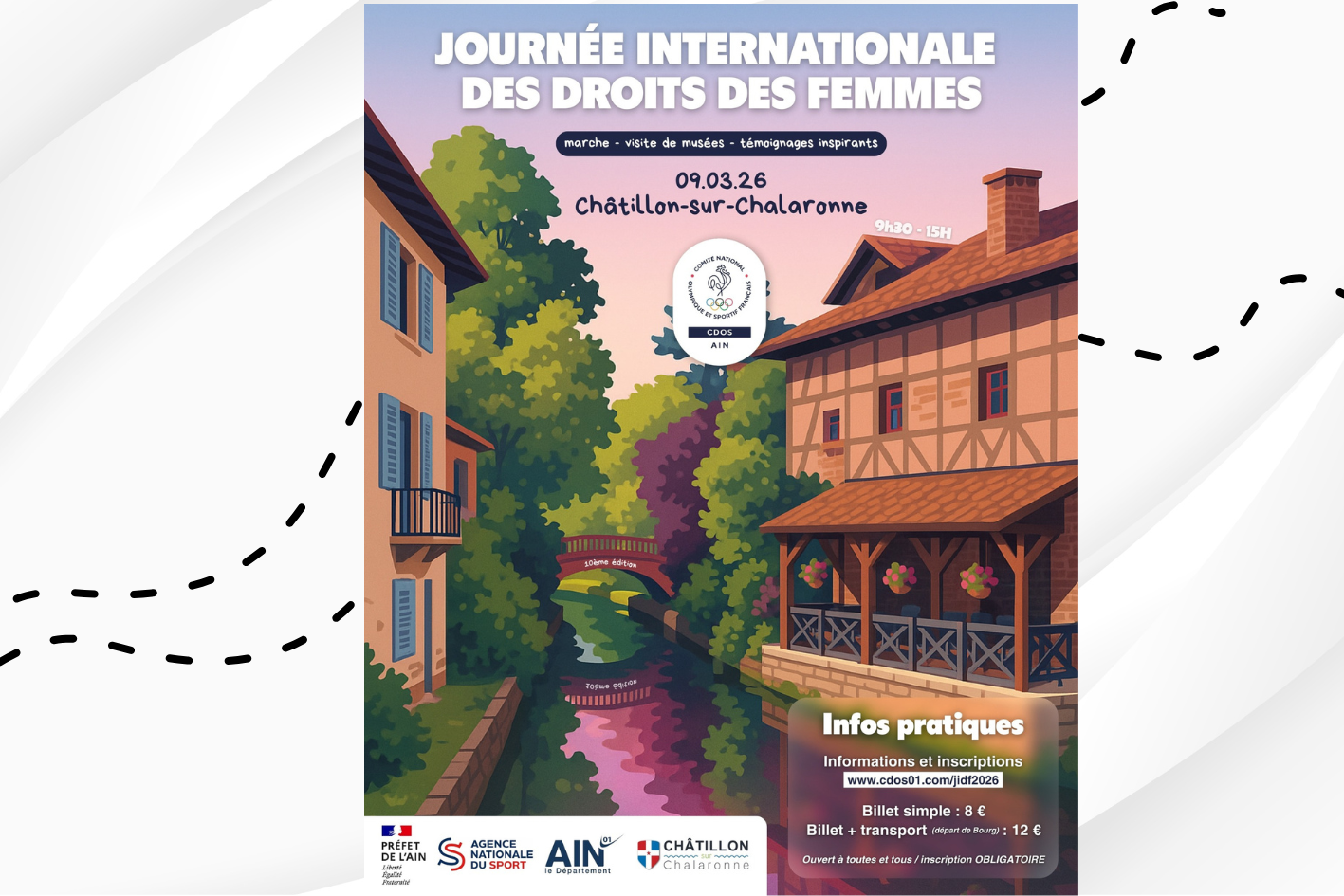 Journée Internationale des Droits des Femmes – 10ᵉ édition Le lundi 9 mars 2026, le CDOS 01 organise la 10ᵉ édition de la Journée Internationale des Droits des Femmes, à Châtillon-sur-Chalaronne. Au programme : Visite guidée de l’Hôtel-Dieu Découverte du
